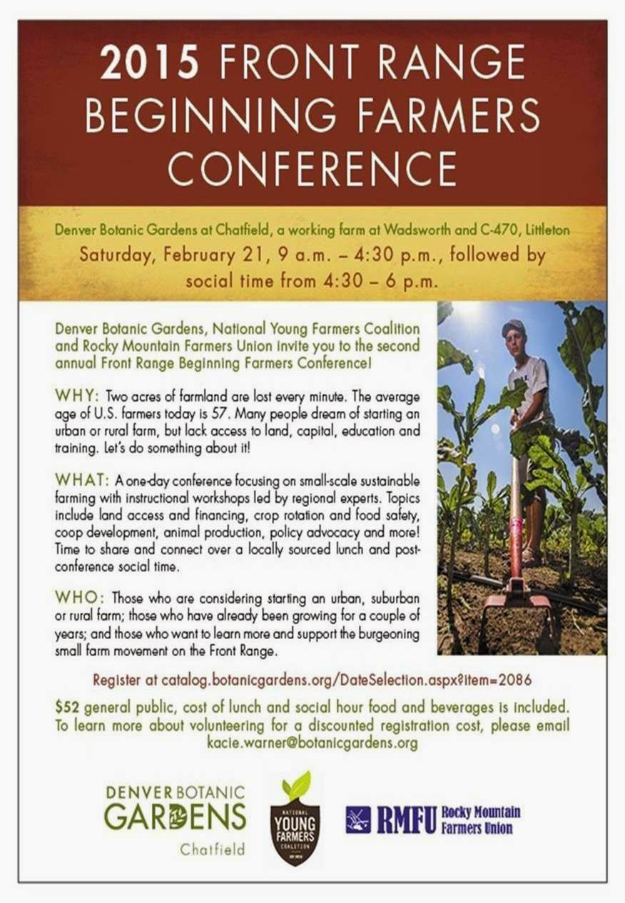 On Feb. 21 we are hosting the 2nd Annual Beginning Farmers conference at Denver Botanic Gardens at Chatfield. The conference will focus on small-scale agriculture. The event takes place 9 a.m. - 4:30 p.m. and a social hour follows until 6 p.m. Please visit www.botanicgardens.org for more info and registration. $52, includes social hour food and beverages.