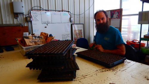 Phil is busy seeding onion and leek varieties in the greenhouse! Next ,he will seed parsley and tomatoes. We have also made improvements to the washstand area and hope to see you all for our Open House in mid-June.